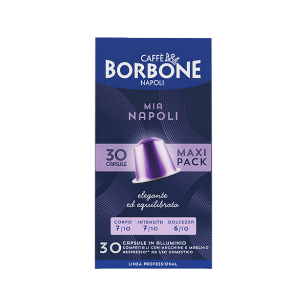 Caffè BorboneMiscela Mia Napoli Caffè Borbone in capsule in alluminio per Nespresso: una miscela che è un perfetto connubio di cremosità e corposità come il più classico dei caffè napoletani.